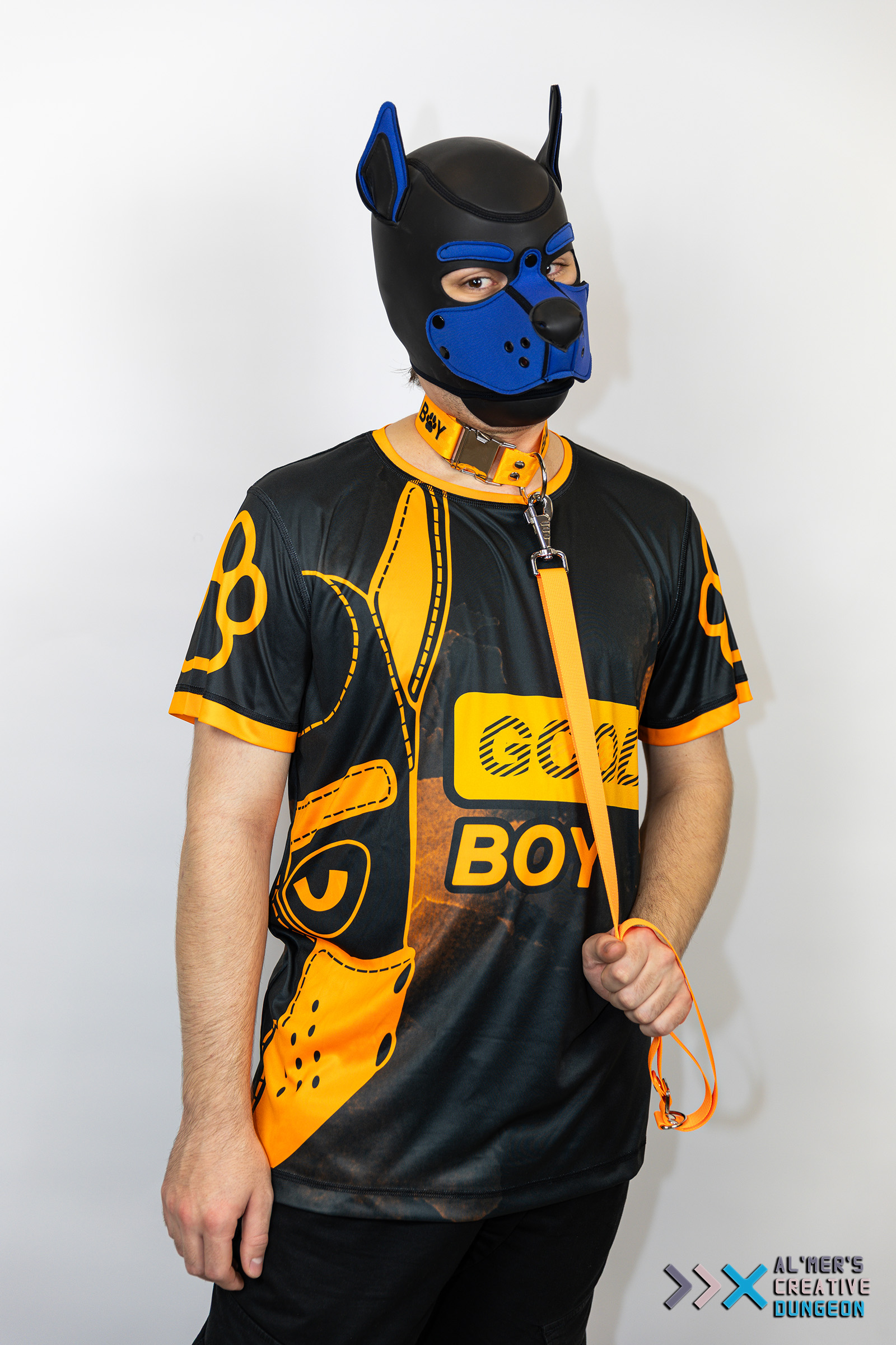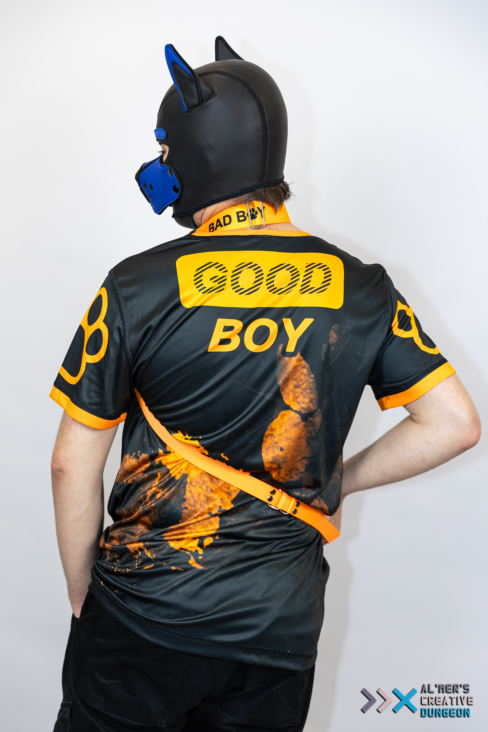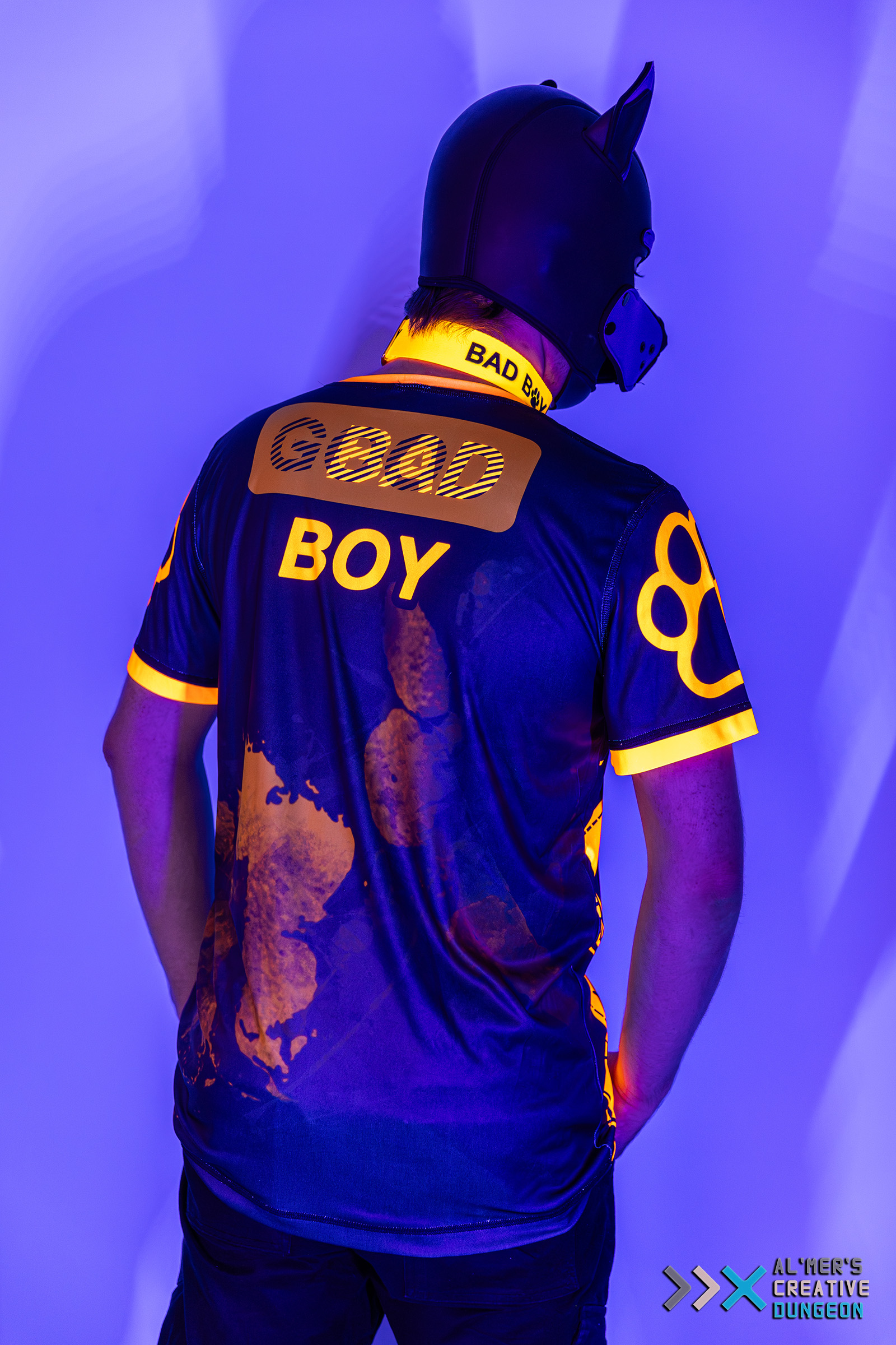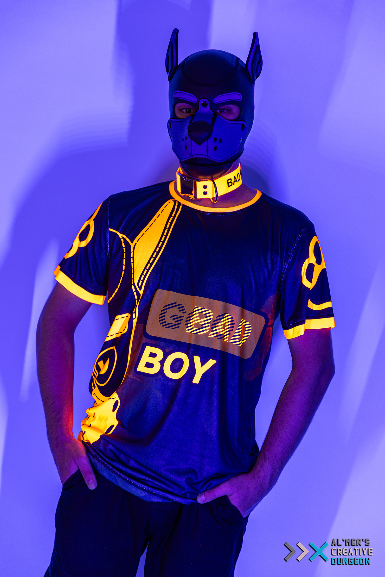 Unleash your personality — both of them! This playful, eye-catching shirt is perfect for pups who love to stand out, whether they’re wagging sweetly or feeling a little mischievous. By normal light, the bold front graphic proudly reads “GOOD BOY.” But step under UV or blacklight, and the design transforms — glowing brightly and flipping to reveal your “BAD BOY” side. Printed and sewn inhouse at our little dungeon. UV-Reactive Print: Glows intensely under blacklight — perfect for nightlife and events. Flip Message Effect: “GOOD BOY” in normal lighting subtly shifts to “BAD BOY” under UV. Vibrant Neon Accents: High-contrast details pop even before the glow starts. Soft, Breathable Fabric: Comfortable for long wear, scene play, or casual outings. Unisex Fit: Ideal for pups of all genders and body types. Perfect for Puppy Play: Matches wonderfully with masks, hoods, collars, and gear. Material: Polyester and Elastane Weight: +/- 150grams Sizing: see the chart Shirt isn't suitable to have a harness worn over it.