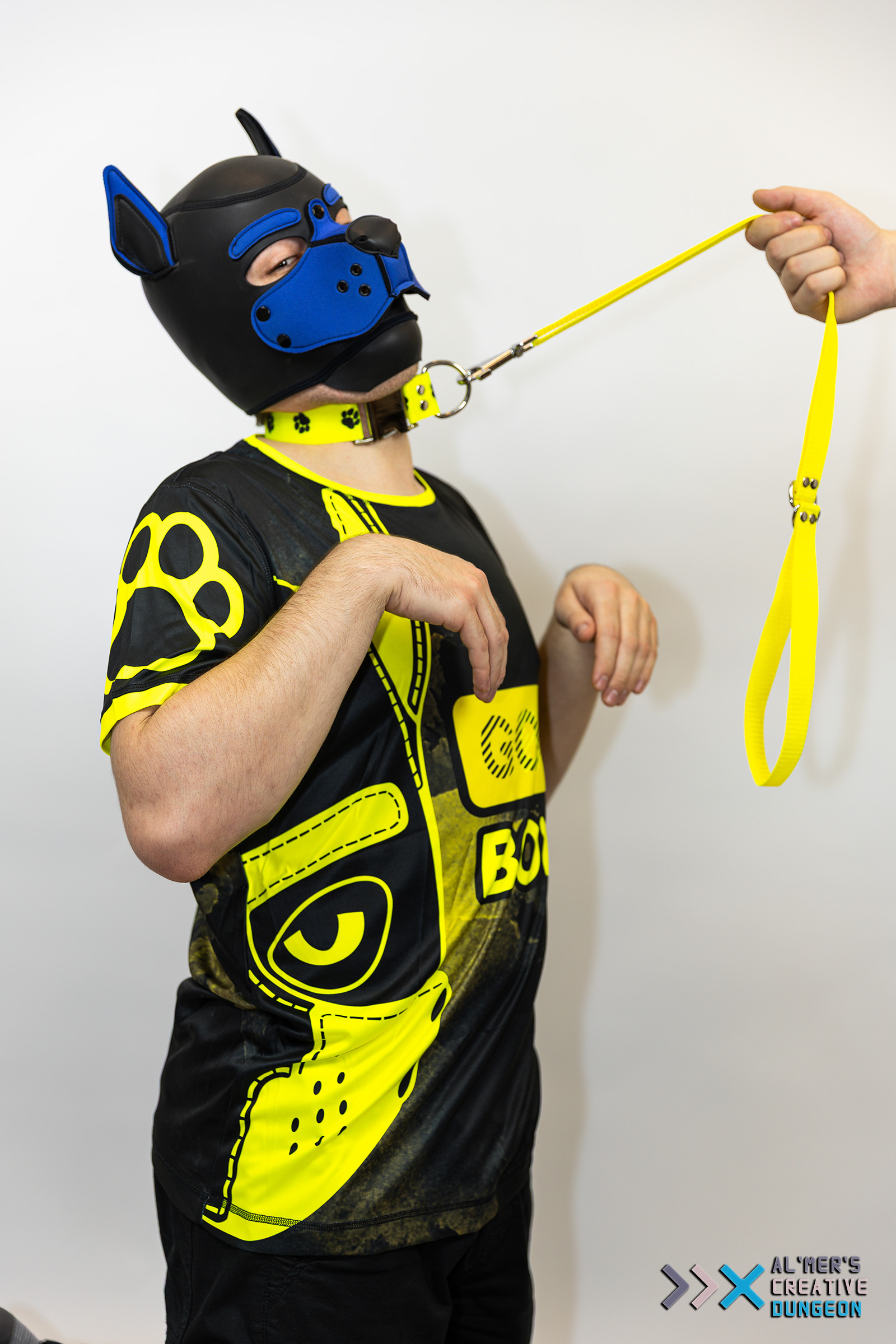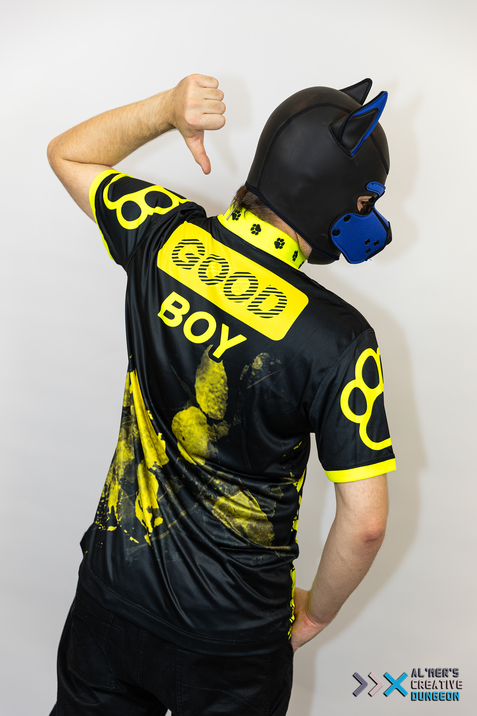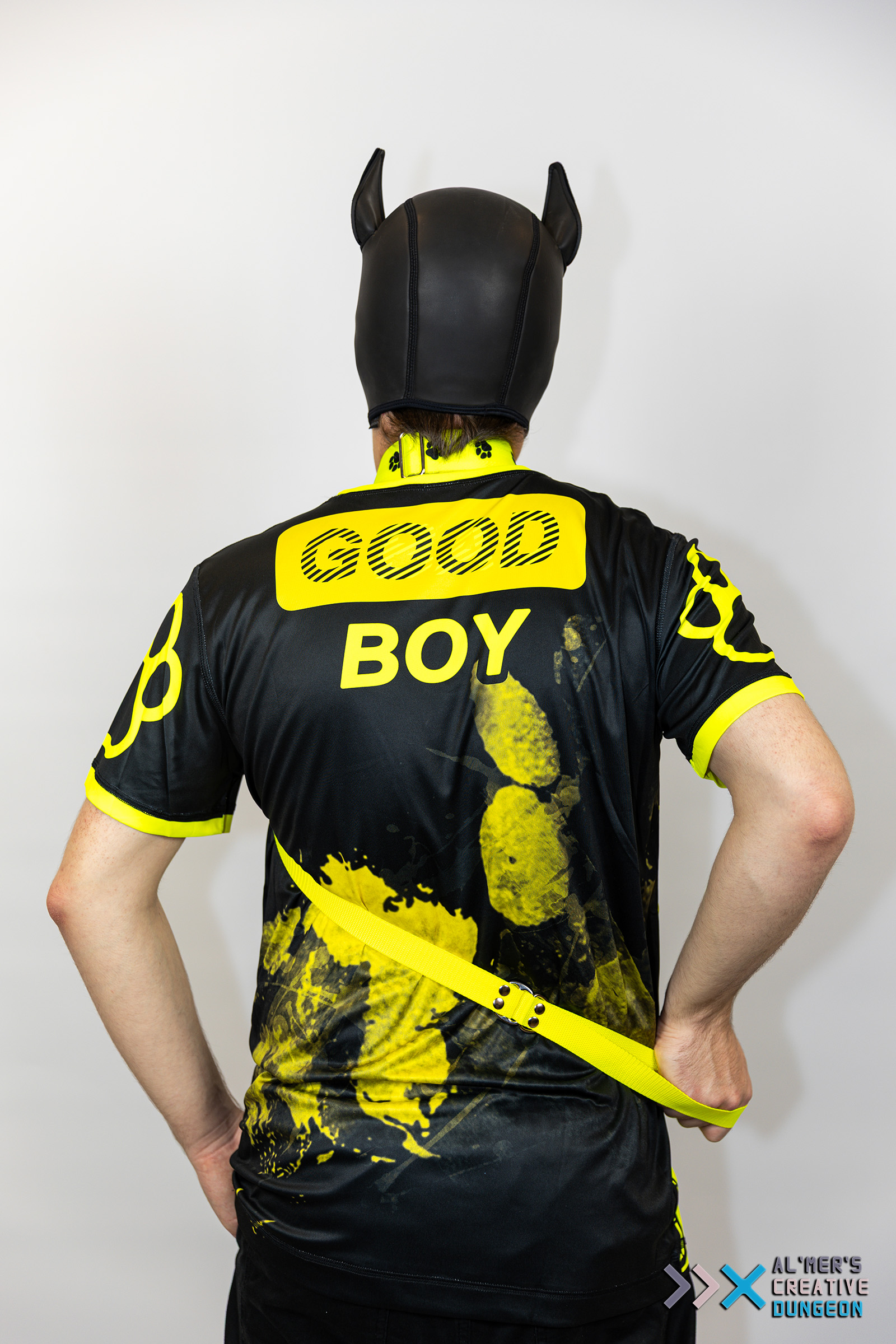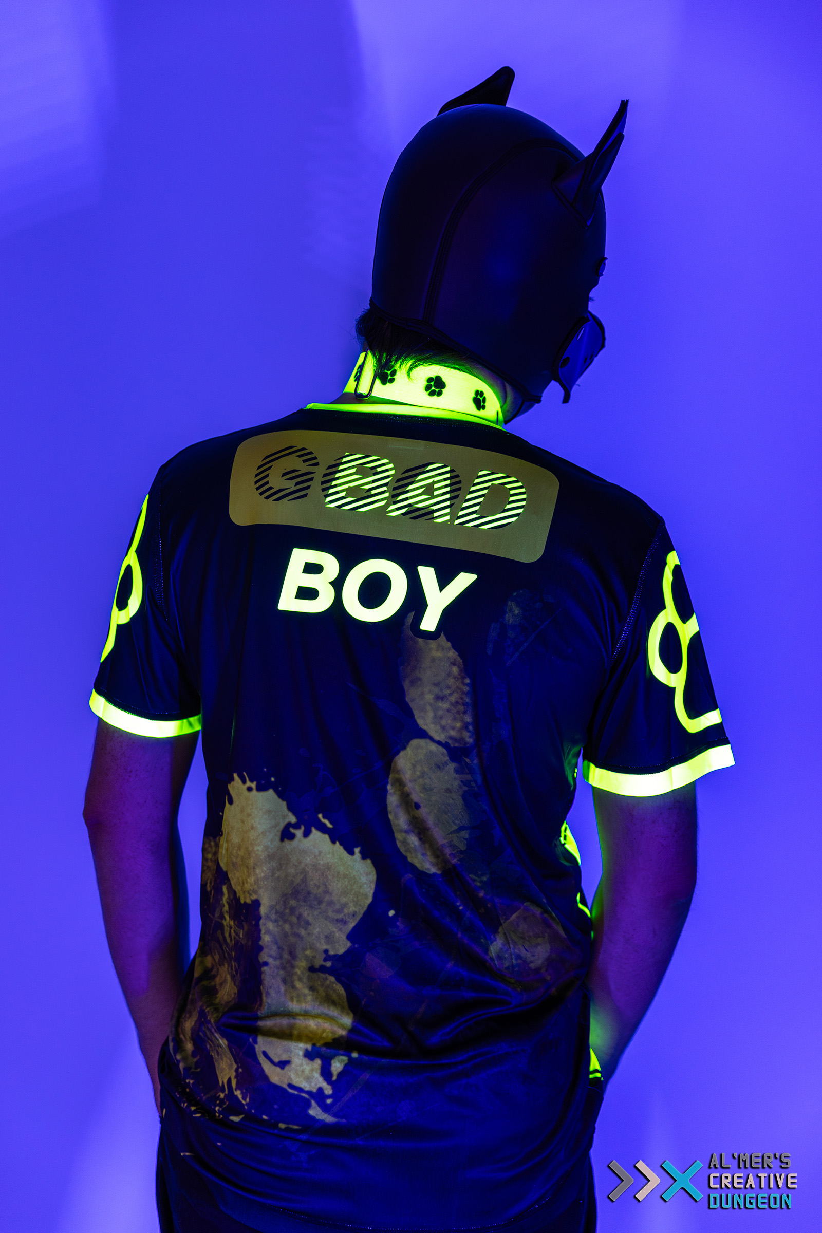 Unleash your personality — both of them! This playful, eye-catching shirt is perfect for pups who love to stand out, whether they’re wagging sweetly or feeling a little mischievous. By normal light, the bold front graphic proudly reads “GOOD BOY.” But step under UV or blacklight, and the design transforms — glowing brightly and flipping to reveal your “BAD BOY” side. Printed and sewn inhouse at our little dungeon. UV-Reactive Print: Glows intensely under blacklight — perfect for nightlife and events. Flip Message Effect: “GOOD BOY” in normal lighting subtly shifts to “BAD BOY” under UV. Vibrant Neon Accents: High-contrast details pop even before the glow starts. Soft, Breathable Fabric: Comfortable for long wear, scene play, or casual outings. Unisex Fit: Ideal for pups of all genders and body types. Perfect for Puppy Play: Matches wonderfully with masks, hoods, collars, and gear. Material: Polyester and Elastane Weight: +/- 150grams Sizing: see the chart Shirt isn't suitable to have a harness worn over it.